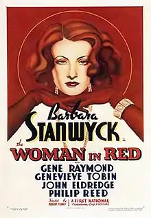 The Woman in Red is a 1935 American drama film directed by Robert Florey and starring Barbara Stanwyck and Gene Raymond. Based on the novel North Shore by Wallace Irwin, the film is about a woman equestrian who meets and falls in love with a traveling polo player from a once wealthy family. After they are married, she is persuaded to entertain her friend's wealthy client aboard a yacht. The client accidentally drowns, and her friend is arrested for his murder. Determined to keep her name out of the press, the friend does not reveal that he has a witness who can prove his innocence.[1]