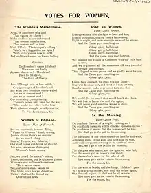 The song was sung in many different settings, but most often as a form of protest or solidarity for women's rights in both the United Kingdom and the United States. The song was sung in order to lift the spirits of prisoners in Holloway Prison in 1908.[3][4] Between 1908 and 1911, the Mascottes Ladies Band often performed "The Women's Marsellaise."[5] In 1913, "The Women's Marsellaise" was sung by a protester in Britain during the trial of two suffragettes.[6] In 1911, it was performed at a suffrage rally in Idaho.[7] Suffragists in North Dakota also sang "The Women's Marsellaise" at an event in 1917.[8]