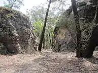 A section of the original The Wool Road from Nerriga that passed through the Bulee Gap cutting was bypassed by the 1856 route but it remained in use as an alternative stock route to the corresponding part to the newer Braidwood Road. During the Second World War, a part of this section of the original road was deliberately destroyed using explosives, to limit access by an enemy to the inland area and the national capital, Canberra.[103]