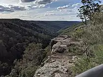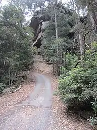 From near the Boolijah Peak, The Wool Road diverged from the current route of the Braidwood Road and followed the route of modern-day Wandean Road, through the steep Wandean Gap.[12] (historically also known as the Jerrawangala Gap[13]), then following ridgelines of tributaries of Wandandian Creek, to Wandandian.[12] In this section, the road's elevation dropped by approximately 2,500 feet in 10 miles[13] (760m in 16 km), as it descended the coastal escarpment, via the locality of Jerrawangala and Wandandian. Most of this part of the route is now only accessible to four-wheel drive traffic.[14]