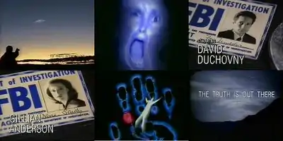The premiere episode of season eight, "Within", revealed the first major change to the opening credits. Along with Patrick, the sequence used new images and updated photos for Duchovny and Anderson, although Duchovny only appears in the opening credits when he appears in an episode. Carter and the production staff saw Duchovny's departure as a chance to change things. The replacement shows various pictures of Scully's pregnancy. According to executive producer Frank Spotnitz, the sequence also features an "abstract" way of showing Mulder's absence in the eighth season: he falls into an eye.[12] Season nine featured an entirely new sequence. Since Anderson wanted to move on, the sequence featured Reyes and Skinner. Duchovny's return to the show for the ninth-season finale, "The Truth" marked the largest number of cast members to be featured in the opening credits, with five.[95] The revival seasons use the series' original opening credits sequence.[96]
