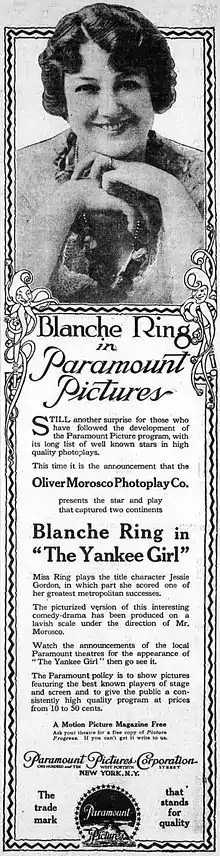 The Yankee Girl is a 1915 silent film comedy produced by Oliver Morosco, distributed by Paramount Pictures and starring Blanche Ring, from the Broadway stage.[1][2] This film though a comedy is actually based on Ring's 1910 musical-comedy play of the same name. Being a silent film of course Ring's singing could not be heard by the film audiences but they would get the rare chance of seeing this Broadway star in a film as many could not afford to make the journey to New York to see her in person in the play.