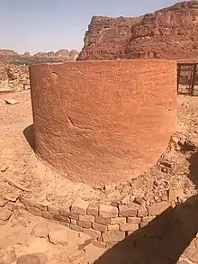 The temple contains a purification basin carved in front of a Lihyanite temple. The diameter of the ancient cistern is 3.75 metres (12.3 ft) and the depth is 2.15 metres (7 ft 1 in), with a capacity of some 2,400 L (530 imp gal; 630 U.S. gal) gallons of water. Three steps have been hewn inside the basin on the northern side of the cistern to facilitate access. It was most likely built to be used in religious rituals, as it is located adjacent to a religious structure.[2][3]