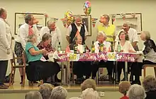 The problem of providing entertainment and maintaining morale under the German Occupation was tackled by Jersey's amateur dramatic societies. The Jersey Opera House, which had been run as a cinema before the war, Wests Picture House, parish halls, church halls and other venues were used for theatrical entertainment.[12] The Playhouse was taken over by the Germans for food storage. By the beginning of 1941 a number of productions were nearing readiness but there was uncertainty as to which company would take the initiative. The Opera House reopened on 6 January 1941 with the Jersey Amateur Dramatic Club's production of Housemaster by Ian Hay,[13] followed on 17 February with a production by the Green Room Club of "The Light of Heart" by Emlyn Williams. A pattern of a new play or theatrical production (revue, variety) every other week was quickly established as associations, such as the Green Room Club, the Amateur Dramatic Club, the Island School of Dancing and Elocution, and the Fifty-Fifty Club, rallied to keep morale up and provide alternative entertainment under conditions of shortage of films and the banning and confiscation of radios. Times of curtain up varied according to the curfew imposed; on occasion when the population were collectively punished for acts of resistance by earlier curfews, the curtain had to rise as early as 6pm. The electricity supply became increasingly erratic. The Opera House was forced to resort to improvised lighting consisting of 3 car headlights in the orchestra pit and lights powered by car batteries in the wings, a system also put into effect at other halls. Appreciation for the actors' efforts were frequently expressed in the form of gifts from audience members in the form of supplements to rations, such as potato flour, sugar beet syrup, butter and other provisions.[12]