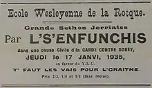In the early 20th century, E. J. Luce wrote plays and presented them around parish halls and other halls. En chèrche d'femme, L'Învitâtion and L'Annonce X Y Z were all written before the First World War, subsequent to the setting up of the Jersey Eisteddfod. The most frequently performed of his plays Lé Procès was published in pamphlet form and was revived as a touring fundraiser during the First World War, remaining a favourite long after.[21]