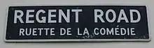 The first identifiable dedicated theatre space in Jersey was opened in 1802 (not counting the unidentified "Théâtre Royal" which appears not to refer to the same building) by James Shatford, proprietor of the Salisbury theatre, to house his visiting English company. It consisted of a converted barn in what now bears the English name of Regent Road and the French name of Ruette de la Comédie in Saint Helier. The French name preserves the memory of the existence of this theatre. Few records survive to give an idea of the layout or appearance of this theatre which was named "The Theatre Royal", but it was described in 1809 as being "neat and sufficiently extensive".[1] Shatford's company were not in permanent residence; in their absence performances were staged by officers of the British regiments garrisoned in Jersey, under the title of "Garrison Theatricals". These performances were open to the public, and raised money for the relief of poor British prisoners of war in France during the Napoleonic Wars. Once the wars were over, the theatre was used intermittently by both English and French visiting troupes but with little financial success. This theatre was superseded in 1828; the fabric survived until demolition in 1947.