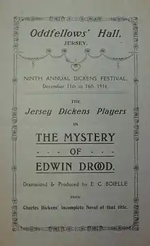Edward Clarence "Teddy" Boielle (1872–1941) abandoned a less than successful business career for a career in entertainment. He brought concert parties to Jersey, was a key organiser of the Coronation celebrations for Edward VII and George V, noted especially for his part in the organisation of the inaugural Jersey Battle of Flowers, was stage manager of the Caesarean Operatic and Dramatic Society. Boielle also performing as the title rôle in The Mikado, as Sir Joseph Porter in HMS Pinafore, Bunthorne in Patience, Mr Pockett in The Magistrate and others. He was founding Secretary of the Jersey Eisteddfod.[8] He dramatised Charles Dickens' The Haunted Man for the Saint Helier's Church Literary Society (another of Dean Samuel Falle's cultural projects besides the Jersey Eisteddfod) in 1908 and staged it at the Oddfellows' Hall in Saint Helier in December 1908, followed by two public performances in January 1909. The success of these performances persuaded cast and author-director to form a regular company for the production of an annual Dickens stage adaptation: 1909–1910 The Chimes; 1910–1911 The Battle of Life; 1911–1912 The Cricket on the Hearth; 1912–1913 The Christmas Carol; 1913–1914 a revival of The Haunted Man; 1914 Scenes from Pickwick; 1915 The Chimes; 1916 Edwin Drood; 1917 The Battle of Life; 1918 The Old Curiosity Shop; 1919 The Cricket on the Hearth; 1921 Oliver Twist. The Oddfellows' Hall was then turned into a cinema, and the Dickens Players moved to the Opera House for their final productions: 1922 a revival of The Christmas Carol; 1924 David Copperfield. E.C. Boielle's commitments as manager of Wests Picture House and competition from new forms of entertainment led to the suspension of the annual Dickens dramatisations, but members of the amateur troupe moved on to other associations.[9]