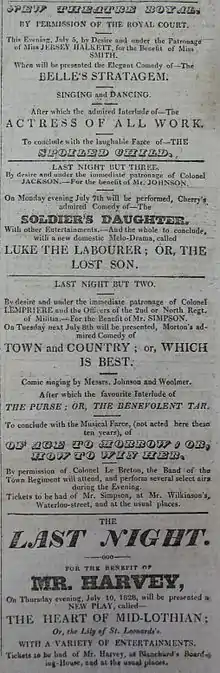 Between 1792 and 1796 there were plays advertised as being performed at the "Théâtre Royal". It is not known whether this refers to the Long Room, but the description of a gallery suggests that this might be a different building unless the Long Room had been altered during this period. Plays were also performed in the 1790s outside Saint Helier. The annual midsummer fair in Saint John attracted huge crowds and the English companies of Fisher and Henry Lee are known to have performed in tents there in 1793 and 1795.[3] The Saint John's fair and its entertainments became such an annoyance to the authorities that it was suppressed by Act of the States in 1797.[5]