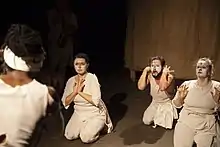In Greek and Roman theatre, makeup was unnecessary. Actors wore various masks, allowing them to portray another gender, age, or entirely different likeness.[1] Thespis, considered to be the first actor, used white lead and wine to paint his face.[2] In medieval Europe, actors altered their appearances by painting their faces a different color. Performers who portrayed God painted their faces white or gold; actors playing angels painted their faces red.[1] During the Renaissance, actors were creative and resourceful when making-over their faces. They used lamb's wool for false beards and flour as face paint.[1]