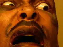 Through the use of makeup, specifically highlighting and shading, the apparent shape of an actor's face can be changed.[3] By highlighting the face's protruding bones, the features become pronounced; shadowing cavities can add depth.[4] Sagging jowls, forehead wrinkles, eye pouches, and prominent veins can be created by manipulating highlights and shadows.[3] A highlight is a base makeup that is at least two shades lighter than the base. It is applied on the bridge of the nose, cheekbones, and areas under the eyes and below the brows.[4] Using a color two shades deeper than the base provides depth and definition. This depth is commonly used on the eye sockets, to thin the sides of the nose, to shallow the cheeks, and to minimize heaviness under the chin.[4]