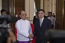 In the first month of his presidency, he sought the support of ASEAN Secretary-General Surin Pitsuwan to support Myanmar's bid to chair the ASEAN Summit in 2014.[23] As of July 2011, the government has formed a planning committee led by foreign affairs minister Wunna Maung Lwin.[24] In his presidency, Myanmar took the ASEAN chairmanship in 2014. ASEAN summit was held in Naypyidaw in the same year.[25]