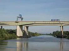 ![]() Main span of the two bridges over the Manchester Ship Canal, with the older bridge in the foreground | |
