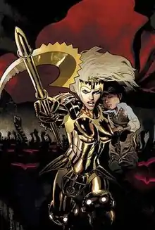 In the 2006 Eternals title, Thena began as normal woman married to Thomas Eliot with a son, Joey, and a researcher at Stark Enterprises. Like Sersi and Makkari, she was affected by Sprite's reality warping to have no memory of her past as an Eternal.[21] Thena assisted at a Vorozheika party organized by Sersi. In the party, the amnesic eternals were attacked by mercenaries of another faction of Vorozheika government, killing her husband. The reunion of four eternals triggered a recovery of their powers.[22] With their returned powers, Thena frees herself from the mercenaries that captured her. Afterwards, she began to suffer terrible nightmares in which she was indeed immortal, and fought off various multicolored Deviants with ease. When she awoke from one of these dreams, she found she had gained back her costume and powers.[23] The Eternals, now remembering their past, arrived to San Francisco to deal with the Dreaming Celestial.They realized that they cannot stop the Celestial (they are programmed to protect him) and leave him be. The Eternals then embark on a quest to go and recruit the other members who have similarly forgotten their true selves due to Sprite's trickery.[24] Thena remained one of the Eternals, keeping her (human) child with her in their home after a heated argument with Ikaris.[25]