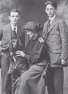 ![]() Countess Markievicz, her dog 'Poppett', Theobald Wolfe Tone FitzGerald (right) and Thomas McDonald (left), members of Na Fianna Eireann, photographed at Waterford in 1917 | |