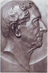 The image shown is from his grave, salvaged after damage from World War II bombing. This grave plaque was sculpted by Carl Seffner.
