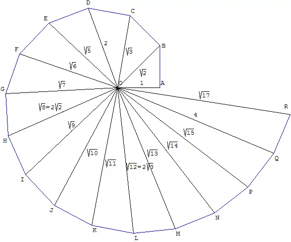 Theodorus here was drawing some figures for us in illustration of roots, showing that squares containing three square feet and five square feet are not commensurable in length with the unit of the foot, and so, selecting each one in its turn up to the square containing seventeen square feet and at that he stopped.[4]