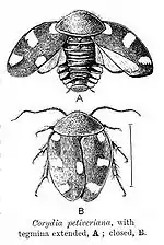 This is the type species for the genus Therea. The species epithet is after James Petiver (1663–1718), who obtained specimens from southern India and Sri Lanka (probably from the surgeon at Fort St. George, either Samuel Browne or more likely Edward Bulkley[13]). Carl Linnaeus placed the species under Cassida and described C. petiveriana and another that he called C. septemguttata, now considered a synonym.[1]