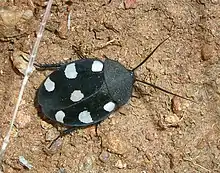 Therea petiveriana, variously called the desert cockroach, seven-spotted cockroach, or Indian domino cockroach, is a species of crepuscular cockroach found in Sri Lanka. They are members of a basal group within the cockroaches.[3][4] This somewhat roundish and contrastingly marked cockroach is mainly found on the ground in scrub forest habitats where they may burrow under leaf litter or loose soil during the heat of the day.[5]