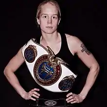 Therese Gunnarsson (born November 30, 1983), nicknamed "The Gun", is a Swedish professional Muay Thai fighter. She started training kickboxing in 2004, but switched to Muay Thai in 2010.[2] She has won both the WAKO Pro title,[3] and the world amateur kickboxing championship. She is the first and only Swedish fighter to accomplish this.