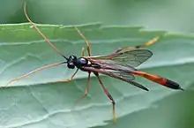 Therion circumflexum can reach a body length of approximately 14–25 millimetres (0.55–0.98 in). The head and thorax of these relatively large parasitic wasps are predominantly black. The scutellum is yellow. The abdomen is predominantly orange. Usually the rear end and the top of the third tergites are black. The female has a short spike. The legs are yellow-orange. The posterior femur and posterior tibia have a dark brown apical end. The wings are orange-hyaline. In the clypeus the median apicali tooth is missing and the hind tarsal claws are evenly curved.[3]