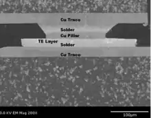 In its simplest form, the P or N leg of a TE couple (the basic building block of all thin-film TE devices) is a layer of thin-film TE material with a solder layer above and below, providing electrical and thermal functionality.