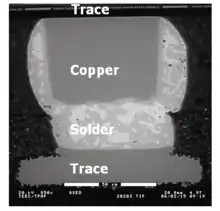 Figure 2 shows an example of a CPB fabricated by Intel and incorporated into their Presler line of microprocessors among others. The cross section shows copper and a copper pillar (approximately 60 um high) electrically connected through an opening (or via) in the chip passivation layer at the top of the picture. At the bottom is another copper trace on the package substrate with solder between the two copper layers.