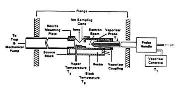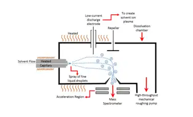 Thermospray is a soft ionization source by which a solvent flow of liquid sample passes through a very thin heated column to become a spray of fine liquid droplets. As a form of atmospheric pressure ionization in mass spectrometry these droplets are then ionized via a low-current discharge electrode to create a solvent ion plasma. A repeller then directs these charged particles through the skimmer and acceleration region to introduce the aerosolized sample to a mass spectrometer. It is particularly useful in liquid chromatography-mass spectrometry (LC-MS).[1][2][3][4][5]