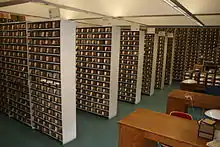 The offices of the TLL contain copies of all surviving Latin texts from 600 CE and earlier.[1] The stacks contain boxes that collectively contain about 10 million slips on which is "every surviving piece of writing from the classical period", sorted into usage categories by word.[1] For example, there are about 90,000 slips for the word 'et' and 50,000 for the word 'non'.[1] These are used as source material to create entries for each word in the thesaurus.