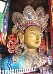 One of the main points of interest is the Maitreya (future Buddha) Temple erected to commemorate visit of the 14th Dalai Lama to this monastery in 1970. It contains a 15 metres (49 ft) high statue of Maitreya Buddha, the largest such statue in Ladakh, covering two stories of the building.[4] He is unusually portrayed as seated in the lotus position rather than his usual representations as standing or in a sitting posture on a high throne. It is the largest Buddha statue in the monastery, and took four years to build. It was made by the local artists under the master Shilp Guru Nawang Tsering of Central Institute of Buddhist Studies (Leh) - in clay, gold paint and copper.[20]