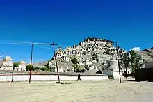 Thikse Gompa or Thikse Monastery (also transliterated from Ladakhi as Tiksey, Thiksey or Thiksay) is a gompa (Tibetan-style monastery) affiliated with the Gelug sect of Tibetan Buddhism. It is located on top of a hill in Thiksey approximately 19 kilometres (12 mi) east of Leh in Ladakh, India.[1] It is noted for its resemblance to the Potala Palace in Lhasa, Tibet, and is the largest gompa in central Ladakh, notably containing a separate set of buildings for female renunciates that has been the source of significant recent building and reorganisation.[2][3]