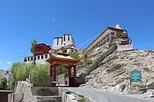 Thikse Monastery is the largest such structure in central Ladakh.[14] Located on a hill slope, its building are arranged in an ascending order of importance and are well spaced, from the foot of the hill housing the dwelling units to the top of the hill enshrining the monasteries and potang (official residence) of the chief lama.[14] The architecture of the monastery strongly resembles the Potala Palace in Lhasa, Tibet, the former official seat of the Dalai Lamas.[15] Thus, Thikse Monastery is also known as 'Mini Potala'.[2] The motorable approach road[16] from the valley passes through the east side of the Thikse Monastery's main building. There is statue of the Tibetan protective deity on this path at the entrance at the lower level. The highest level of the complex has a stupa (chorten).[10]