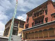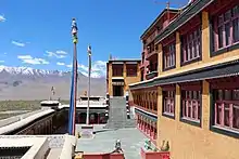 The monastery precinct at the foot of the hill has a courtyard from where a flight of steps leads to the main monastery (one of the 10 temples here), which is 12 stories in height. It has two main chambers. The monastery is painted in red, ochre and white and houses 60 lamas.[17] It has an attached nunnery. Like Likir and Rangdum monasteries, it was built as a fort monastery in the Central Tibetan pattern.[18][19] There are excellent views across the Indus Valley flood plain both east and westbound from it, from which the gompa at Matho (to the east), the royal palace at Stok (across the valley to the south) and the former royal palace at Shey (to the west) are clearly visible.