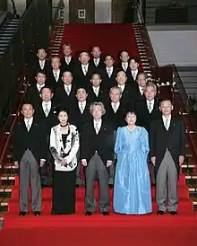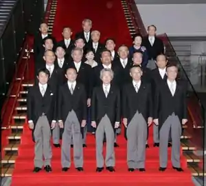 ![]() Prime Minister Junichiro Koizumi (front row, centre) with the re-elected cabinet inside the Kantei, September 21, 2005 | |