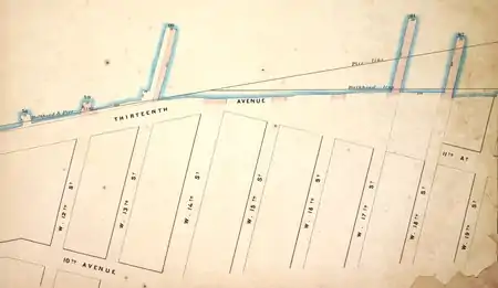 Thirteenth Avenue was built in 1837 on landfill along the Hudson River, becoming the westernmost avenue in downtown and lower-midtown Manhattan.[1] An 1891 map published by G. W. Bromley shows Thirteenth Avenue heading north from 11th Street to around 29th Street, where it merged into 12th Avenue.