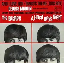 An instrumental version of "This Boy", orchestrated by George Martin, is used as the incidental music during Ringo Starr's towpath scene in the film A Hard Day's Night. The piece, under the title, "Ringo's Theme (This Boy)" was released as a single—but failed to chart in the UK—on 7 August 1964 with "And I Love Her" on the A-Side,[11] although it did reach number 53 in the American Top 100 later that year. It was also included on Martin's Parlophone album Off the Beatle Track and the EP Music From A Hard Day’s Night by the George Martin Orchestra, released 19 February 1965. It was also included on the American A Hard Day's Night soundtrack album. Jimmy Page's backing guitar work can be heard on "Ringo’s Theme", which plays as the Beatles drummer wanders around London on his own.