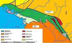 The timing of the tectonic movements is based mainly on comparisons with lithologically and structurally similar terranes in the Armorican Massif (Chantonnay Syncline in the Vendée) and in the Rouergue. In the southern Armorican Massif the dextral shearing motions are timed as Namurian and Westphalian (Serpukhovian till Moscovian), i.e. 325 till 305 million years ago. One can therefore propose for the deformations in the Thiviers-Payzac Unit of the Bas-Limousin, which is regarded as the southeastern prolongation of the Vendée, a middle to late Carboniferous age. Similar ages for the leucogranites in the northern and central Limousin seem to support this assumption.[7]