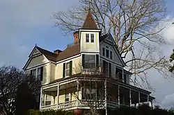 The Thomas B. Finley House, also known as The Oaks, is a historic home located at North Wilkesboro, Wilkes County, North Carolina. It was designed by architect Norma Bonniwell (1877–1961) and built in 1893. It is a two-story, Queen Anne style frame dwelling with a one-story rear ell. It features a hip and gable roof, corner tower, fish-scale-cut wood shingles, and one-story, hip-roofed, wraparound porch. It was built for prominent attorney Thomas B. Finley (1862–1942), whose firm Finley and Hendren occupied the Thomas B. Finley Law Office at Wilkesboro.[2]