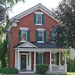 The Thomas Early House is a 2-1/2 story brick side-hall plan Greek Revival gable-fronted house with a single story shed-roofed clapboard addition in the rear, and a later single story flat-roofed aluminum-sided addition behind that. The main section is constructed of well-crafted brick, where the bricks are of an unusually small size, with a light colored mortar dividing them. The facade has distinctive and varied Greek Revival details, with deep cornice returns and an entry with rectangular transom and sidelights. The windows are six-over-six double-hung sash units with shutters. The lintels on the first and second floors are of cut stone, painted white and shaped to match the window and door surrounds. A single story hipped roof wooden front porch, likely constructed in the early 20th century, extends across the front of the house.[2]