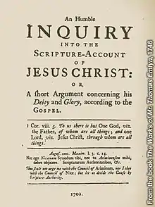 Emlyn was then chaplain to Sir Robert Rich, afterwards (1691) becoming colleague to Joseph Boyse, presbyterian minister in Dublin. From this office he was virtually dismissed on his own confession of unitarianism, and for publishing An Humble Inquiry into the Scripture Account of Jesus Christ (1702) was sentenced to a year's imprisonment for blasphemy and a fine of £1000. More than two years later (thanks to the intervention of Boyse), he was released in 1705 on payment of £90.[1][2]