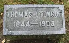 Tongue and his wife, the former Emily M. Eagleton, had eight children: Edmund Burke Tongue, Edwin Tongue, Mary G. Lombard, Thomas H. Tongue, Jr., Elizabeth Fey, Florence Munger, Bertha Rebecca Tongue, and Edith. Edith married Alfred E. Reames, who would serve in the United States Senate.[2] Thomas Tongue, Jr. and Edmund both became lawyers, with the older Edmund forming a legal partnership with his father in 1897.[14] Congressman Tongue was buried in Hillsboro, Oregon, at the family's private plot next to the Masonic Cemetery (now Pioneer Cemetery).[1] Tongue was the grandfather of Thomas H. Tongue III (1912 – 1994), who served as an associate justice of the Oregon Supreme Court.[11]