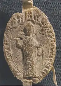 Thomas was present, when Gentile negotiated with the most powerful oligarch Matthew Csák in the Pauline Monastery of Kékes on 10 November 1308.[6] The archbishop presided that general diet in the presence of Gentile in the Dominican monastery of Pest on 27 November 1308, which elected Charles king.[5] Gentile and Thomas convoked the synod of the Hungarian prelates, who declared the monarch inviolable in December 1308. In preparation for the coronation, they also urged the Transylvanian oligarch Ladislaus Kán, who captured Otto, to hand over the Holy Crown to Charles, but he refused to do so. As a result, Thomas crowned Charles king with a newly prepared and consecrated crown in the Church of Our Lady in Buda on 15 or 16 June 1309.[10] However, most Hungarians regarded the ceremony invalid. After that Gentile excommunicated Ladislaus Kán. Thereafter Thomas, alongside Amadeus Aba and Dominic Rátót, negotiated with the voivode in Szeged on 8 April 1310, on the conditions of return of the crown. Ladislaus Kán finally agreed to give the Holy Crown to Charles.[12][10] On 27 August 1310, Archbishop Thomas put the Holy Crown on Charles' head in Székesfehérvár; thus, Charles' third coronation was performed in full accordance with customary law.[13]