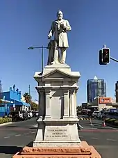 The commissioning of the Brisbane statue encountered a series of setbacks. The sculptor Achille Simonetti was approached by the committee to create the statue. However, Simonetti had never seen Byrnes during his life and produced a plaster cast from photographs for the committee's approval before commencing the statue. The committee did not think the cast was sufficiently like Byrnes and there were a number of iterations before they were satisfied.[8][9] Then there was an argument of whether Byrnes should be depicted in a university gown or in an ordinary frock coat, deciding on a frock coat in order to depict Byrnes as the premier rather than as a lawyer.[10] Then as Simonetti was tendering to provide a 9-foot-tall bronze statue for £1,800, a local sculptor James Laurence Watts offered to provide the statue for only £1,000, dividing the committee.[11][12] However, after Byrnes' sisters indicated their strong preference for Simonetti's work and Simonetti offered a revised tender of £1400, the committee went ahead and commissioned the statue from Simonetti.[13] Early in 1900, the argument about the clothing erupted once more when Simonetti expressed an artistic preference for robes rather than a frock coat, and the committee reversed its decision in favour of robes.[14] During this argument, Simonetti took ill and died. It was then announced in the newspaper that it had been Simonetti's wish that his former pupil, James White, should complete his unfinished commissions.[15] The committee negotiated with White,[16] but finally gave the commission to sculptor Bertram Mackennal.[17]