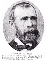 Thomas Karren was born on the Isle of Man, 1 May 1810; died in Lehi, Utah 4 Apr 1876.[1][2] He joined the Mormon Battalion in 1846 and was honorably discharged in 1847.[3] In 1852 he was among the first LDS missionaries sent to the Sandwich Islands (Hawaii).[4]