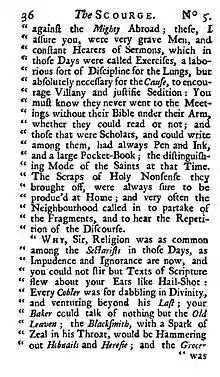 In 1717 Lewis established The Scourge, in vindication of the Church of England, a periodical sheet that appeared every Monday. It abused dissenters, latitudinarians, and Catholics. On 15 July 1717 Lewis denounced Benjamin Hoadly from the text, "Who is this uncircumcised Philistine that he should defie the Armes of the Living God?" Six weeks later he launched an attack on Scottish presbyterianism with the words "Every beast loveth his like". The paper was presented by the grand jury of Westminster as the work of a libeller and an embroiler of the nation, and Lewis, who absconded, was ordered to stand his trial for sedition at the court of king's bench. In the meantime there appeared The Scourge Scourged, or a short Account of the Life of the Author of the Scourge, vilifying Lewis and his "weekly excrement".[2]