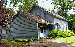 The south-facing front facades of both blocks feature windows and an entrance in the westernmost bay. The main block's door is a board-and-batten piece that retains its original ironwork. There is a single window on the west elevation; on the east is a three-sided projecting bay window added later on. A brick chimney comes up from the roof at the west.[1]