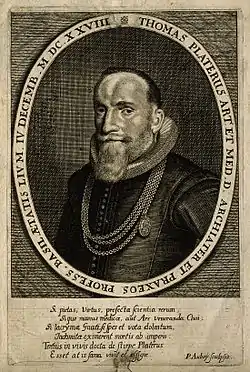 Thomas Platter the Younger (/ˈplɑːtər/; German: [ˈplatɐ]; c. 24 July 1574 in Basel – 4 December 1628 in Basel)[1] was a Swiss-born physician, traveller and diarist, the son of the humanist Thomas Platter the Elder.