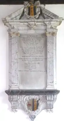 He died on 9 January 1747/48, aged 68.[7] "A stone of eight ounces and one dram was found in his kidneys".[8] His mural monument survives in Broadhembury Church, Devon, erected by his daughter Mrs Drewe. It displays at top the canting arms of Rose: Sable, on a pale or three roses gules slipt and leaved proper; Crest at top: A rose slipped and leaved; bottom: Drewe (Ermine, a lion passant gules) impaling Rose. It is inscribed as follows: