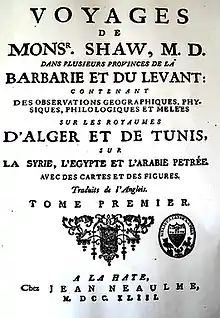 The first edition of Shaw's Travels in Barbary and the Levant was printed at Oxford, in 1738. Richard Pococke commented unfavourably on parts of the work in his Description of the East (1745), and Shaw published two supplements in vindication, which were incorporated in the edition of 1757.