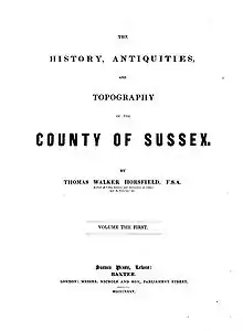 Horsfield compiled for John Baxter The History and Antiquities of Lewes and its vicinity (with an appendix, an Essay on the Natural History of the District by Gideon Mantell), two vols. Lewes, 1824–7. This was followed by a more major undertaking, The History and Antiquities and Topography of the County of Sussex, two vols. Lewes, 1835. For the first volume, which contains East Sussex, Horsfield was assisted by William Durrant Cooper; the second volume, on West Sussex, is mainly an abridgment of the histories of James Dallaway and Edmund Cartwright (1773–1833).[2]
