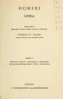 - Homeri Opera V. Hymns, Epic Cycles, Fragments, etc. Oxford Classical Texts. Edited by Thomas W. Allen.
